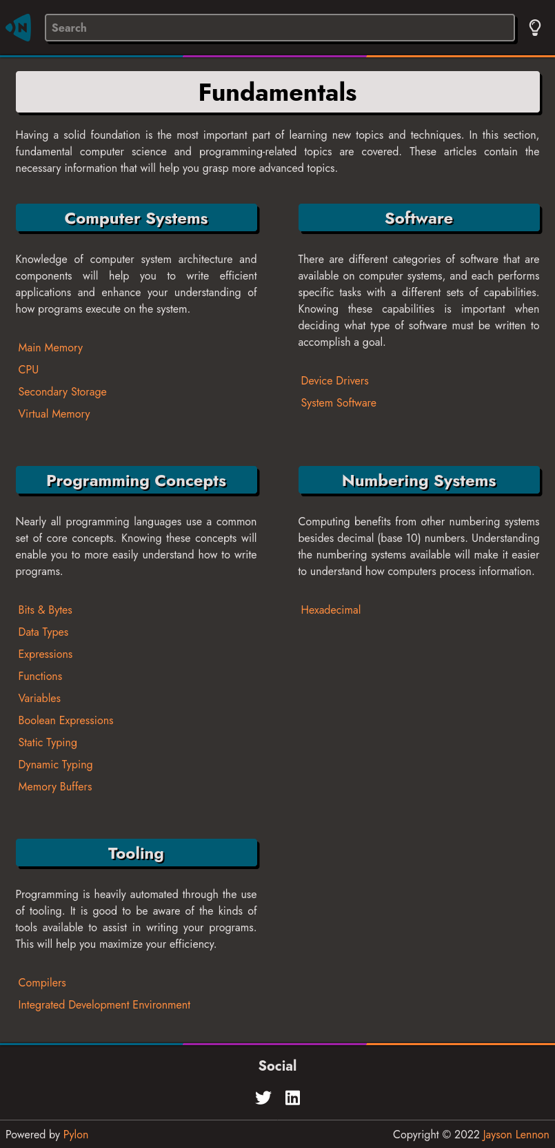 Back in 2022 I had a fun idea to build a website containing articles for computer science and programming topics. It was meant to have an easily searchable database and a user-friendly UI. However, I was never able to commit to making it fully realized. Fast-forward to 2026 and LLMs are the new search engines, so this project won't be going anywhere.