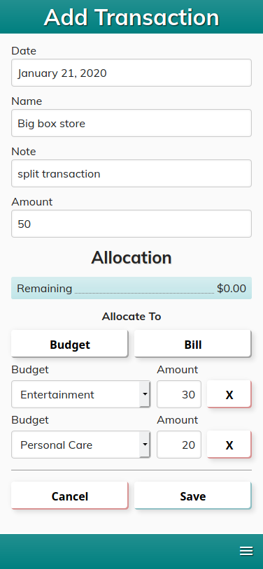 Transactions can easily be added to specific categories by clicking the "+" button next to the category name. They can also be split to any number of bills or budgets, which is great when making purchases at big box stores. The interface checks for proper transaction splits, so everything is always accounted for.