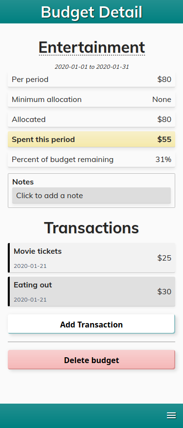 Overall I am happy with the result. The app looks clean, runs quickly on the mobile devices tested, and is able to handle our budgeting needs. There are still some features I would like to add, but for now the project is completely usable and basically "done"!