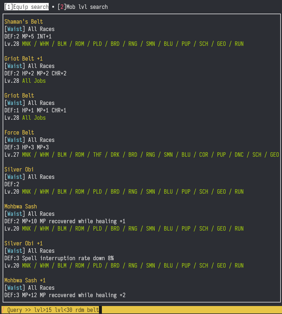 I recently built XILocal, a terminal-based application for exploring Final Fantasy XI (FFXI) game data. This project combines my interests in Rust programming, database design, and creating intuitive command-line tools. In this post, I'll walk you through the key features of XILocal.