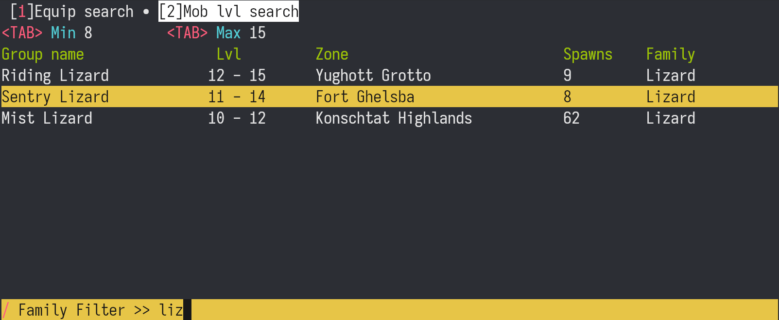 The application provides two main features: equipment search and mob level search, all accessible through a clean, keyboard-driven interface.